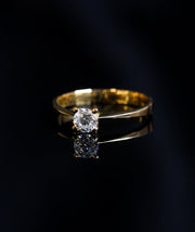 A solitaire ring is a ring that has one diamond. The diamond can be any shape (round, oval, etc.) and any size. The colour of the diamond is usually clear, but it can be colourless as well. A solitaire ring is commonly known as an engagement ring.